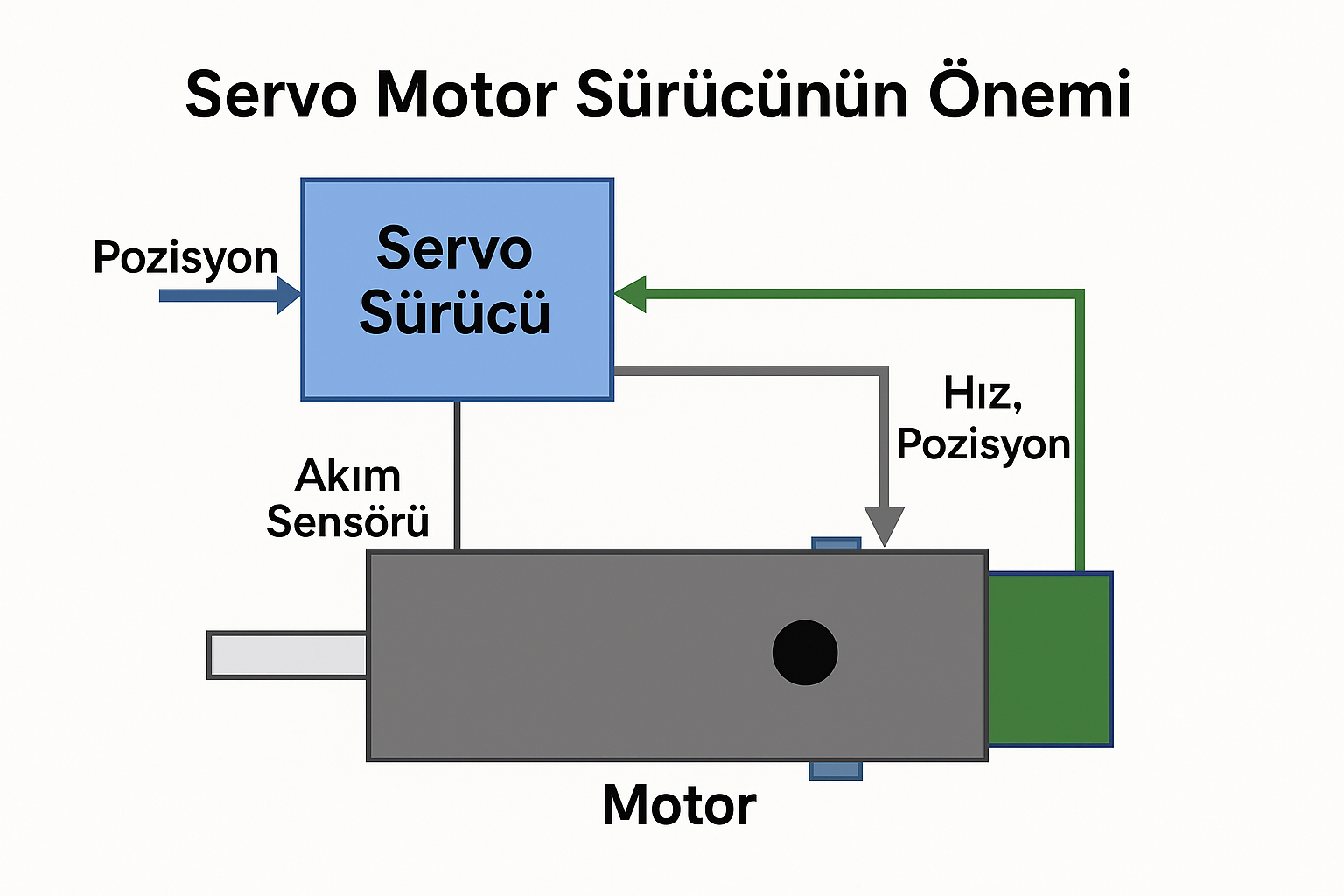 Servo sürücüsü, motoru çalıştıran ve kontrol eden kritik bir bileşendir. Sürücü, komut sinyallerini alır, motor sargılarına uygun akım ve voltaj sağlar ve geri besleme sinyallerini işleyerek kapalı döngü kontrolü uygular. Servo sürücüsü olmadan, motorun hassas konum ve hız kontrolü mümkün değildir.